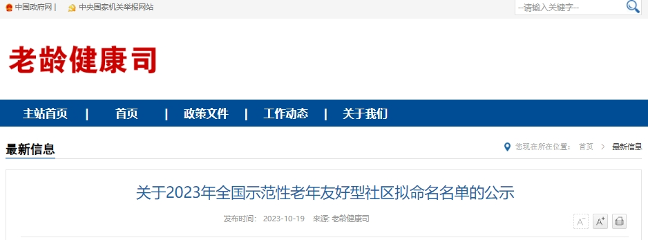 近日国家卫健委老龄健康司发布《关于2023年全国示范性老年友好型社区拟命名名单的公示》。