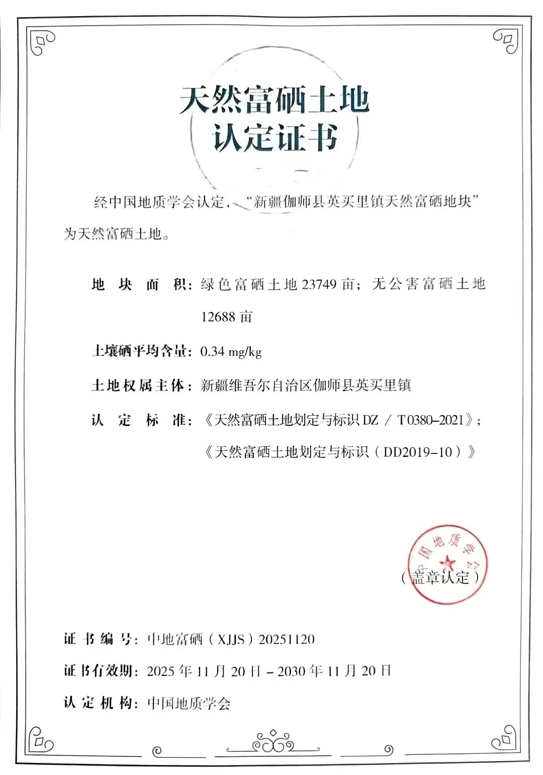 作为国家优质粮棉和稀有果品生产基地,伽师县已培育出伽师新梅、伽师瓜、伽师棉花、伽师甜菜等一大批品质优良、规模可观、品牌价值高的特色农产品,成为当地群众增收致富的重要支撑。此次天然富硒土地的成功认定,不仅是对伽师县特色资源的权威认可,更为当地依托资源优势延伸农业产业链、提升产品附加值注入了强劲动能。