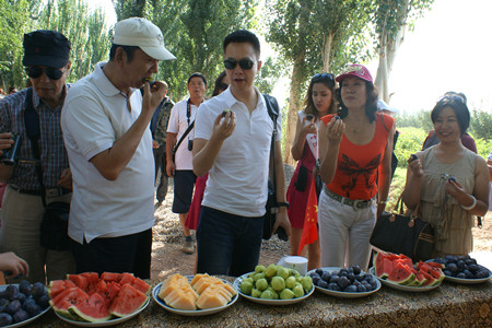 媒体记者们正在品尝刚从田里采摘的新鲜果品