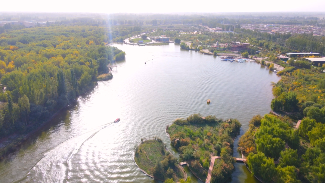 城中胡杨生态园游览车穿梭、观光自行车慢行、湖面游船荡漾、快艇飞驰。