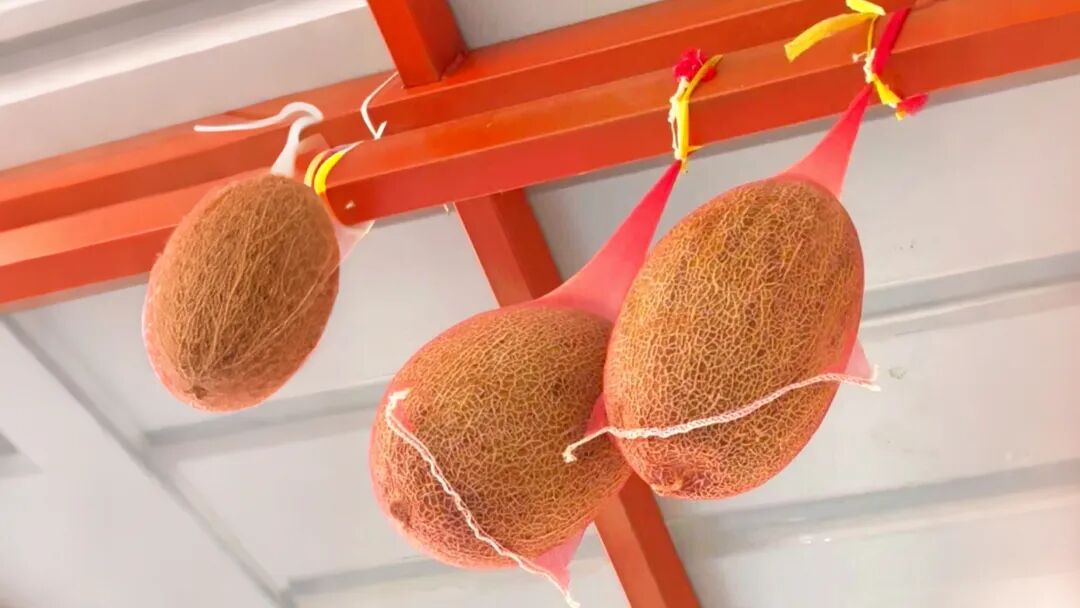 瓜与瓜之间互不挤压,保持外形完整。悬挂在高处一目了然,农户在院里就能清楚观察每个瓜的状态——表皮是否光滑如初、是否有变质的迹象,管护起来便捷高效,仿佛每一个瓜都在农户的悉心呵护下安然“沉睡”。