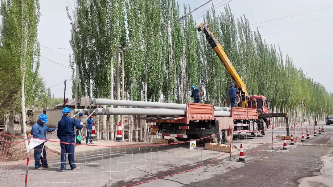 4月10日,伽师县和夏阿瓦提镇,国网伽师县供电公司的施工人员身着工装、分工协作,立杆、架线、固定……一系列操作规范有序、高效推进,当天计划完成30基电杆立杆任务,用实干落实全国两会精神,为乡村全面振兴铺就电力快车道。