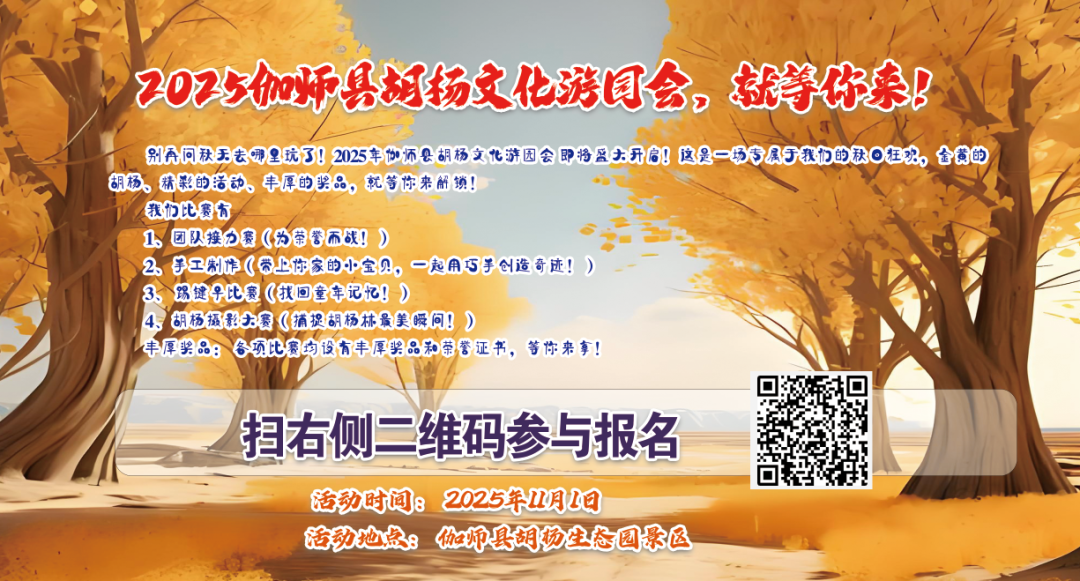 别再问秋天去哪里玩了!2025年伽师县胡杨文化游园会即将盛大开启!这是一场专属于我们的秋日狂欢,金黄的胡杨、精彩的活动、丰厚的奖品,就等你来解锁!
